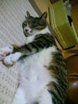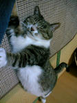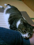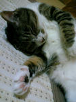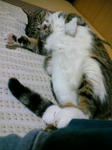 姉ちゃんの足に爪を引っ掛けて伸びをするにゃ。